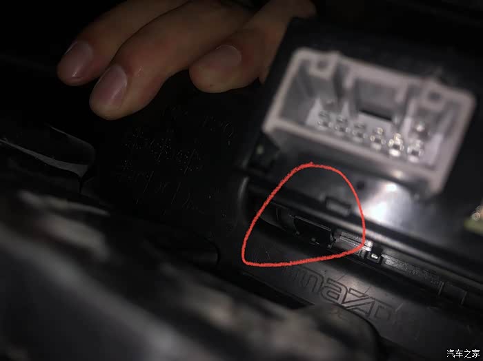拔掉后面的线束后我们需要取出低配USB盒子,先找一把小点的一字起子,从背面别住如图所示的卡口,卡口总共四个分布在盒子的四个角,一边别着,一边往外推就可以取出盒子了。