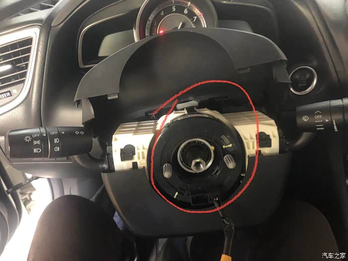 拆掉方向盘转向柱下外壳,之前更换自动大灯和感应雨刮有提过拆卸方法,下壳取下来的时候注意要往前拽一下,里面有个别子是插进去的,强行往下拽的话别子会被卡断。取掉下壳后把方向盘下方右侧的24针插口拔出来。
