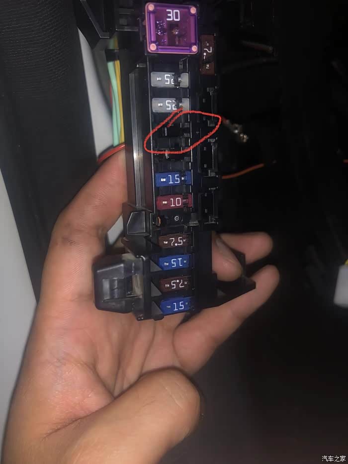然后把火线插口插到保险盒如图的位置(从背面插)。注意所有都装好后再插上保险通电。