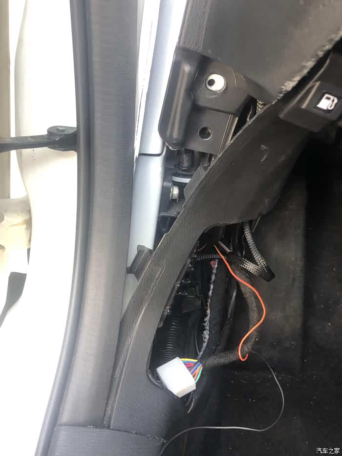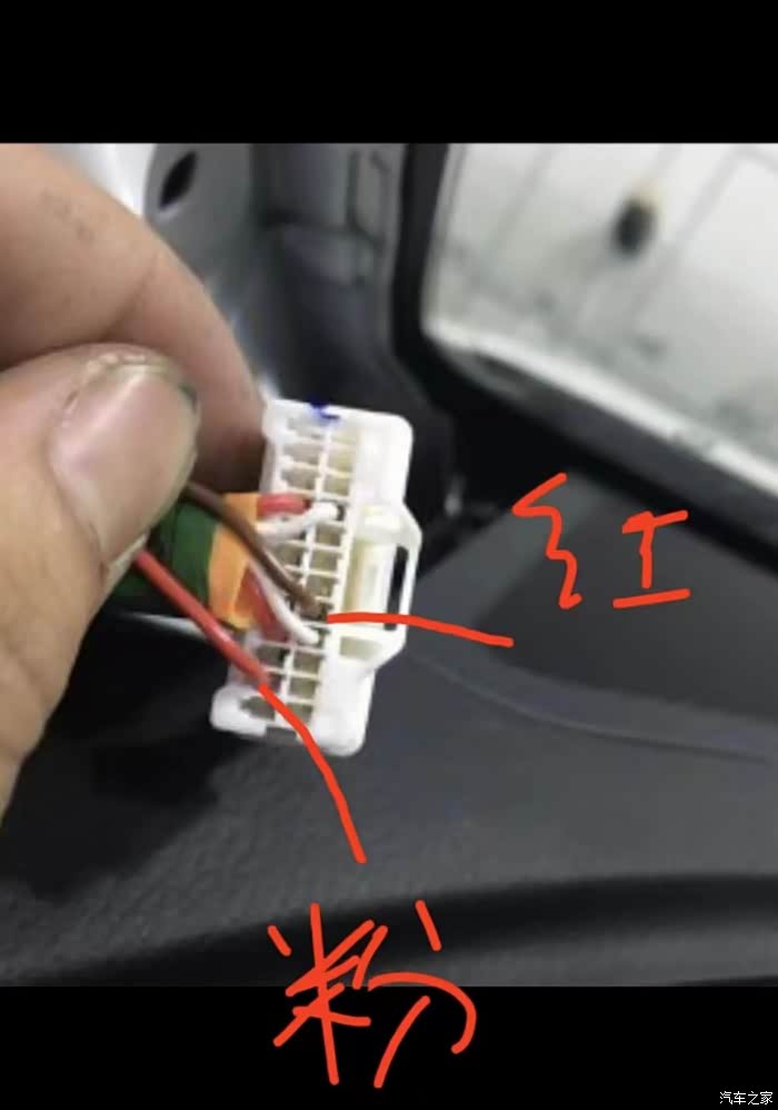 按照此图把红线和粉线插到相应的位置,要插到底,注意千万别插错了,然后把盖子合上。插回原有的线头,装好A柱盖子。