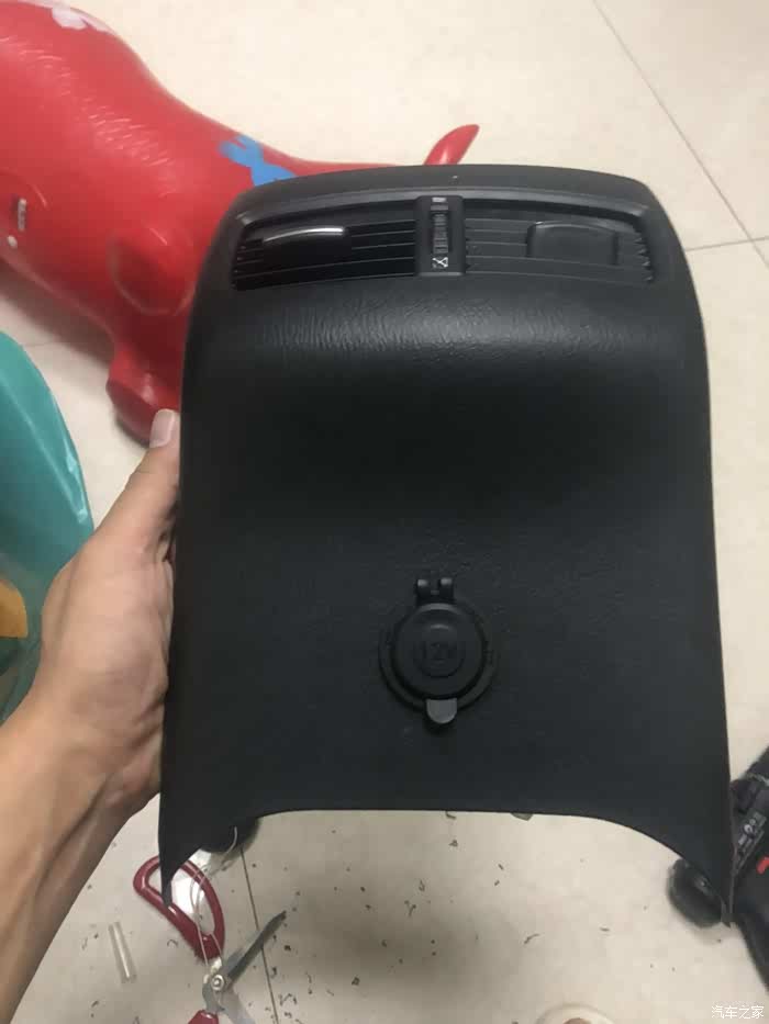 装回到扶手箱上我们发现不是很贴合,没关系我们有手,解决方法是扶手箱缝隙里填入硅胶,扶手箱和出风口面板贴皮(出风口面板的贴皮淘宝有卖完美匹配的)。