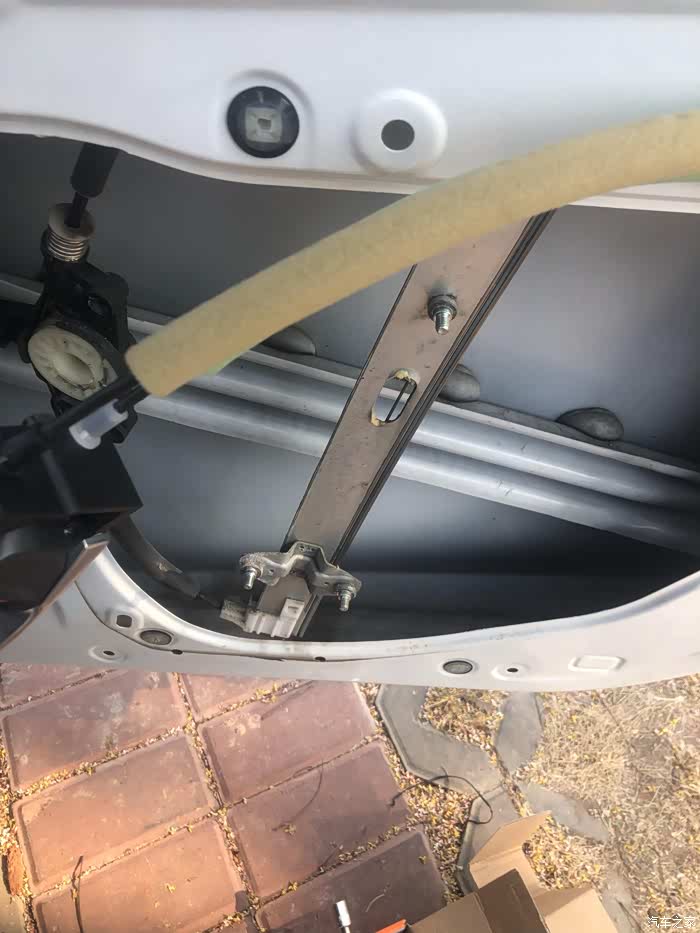 拆掉门板后把这个防尘盖抠出来会看到里面有三颗10号螺丝,用长点的套筒把它拧下来,后视镜就可以取下来了(注意先把插头拔掉)。安上后换的后视镜总成原路装回螺丝和防尘盖。