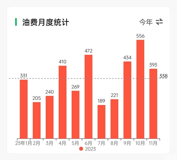 每月油费的支出,平均338,还算可以吧。