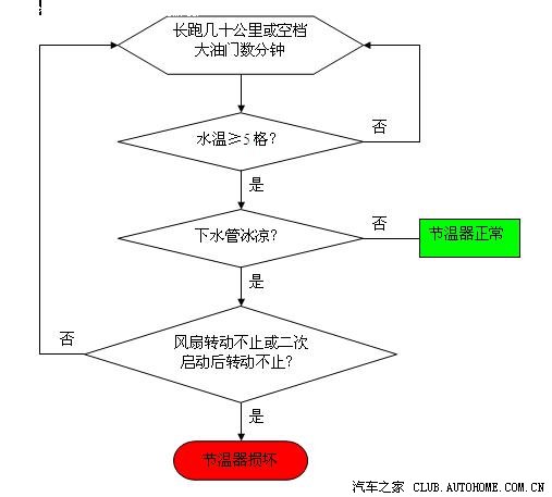 小弟做软件的,今天上来看到大家都在讨论节温器的问题,学习消化了一下各位分享的知识,做了如下判断节温器的流程图,如有不对,请指正,我将及时修改,更新版本。
