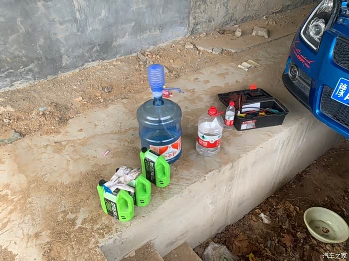 本来想着前轮用千斤顶顶起来更换,无奈还是太低,根本没法操作,突然想到旁边驾校里有个地沟,就开过去!事先准备了:娃哈哈大桶纯净水,(论坛其他帖子说要用屈臣氏蒸馏水,家里没矿想想还是用大桶纯净水吧,应该没差吧?)防冻液5L左右,工具箱一个,手电筒,脸盆,应该就这么多吧,看下图,