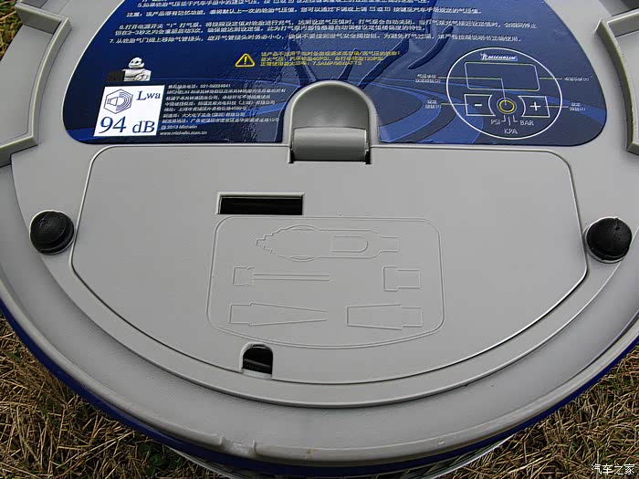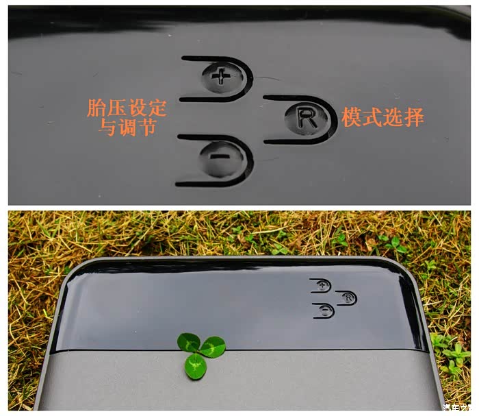 正面的上方是功能操作区及显示区,采用亮光面板,所以看不见(隐藏)显示区域,这是其中一个特点。 其次,功能键非常简洁,就3个(+-调节胎压,R调节模式),而且是和面板一体的。