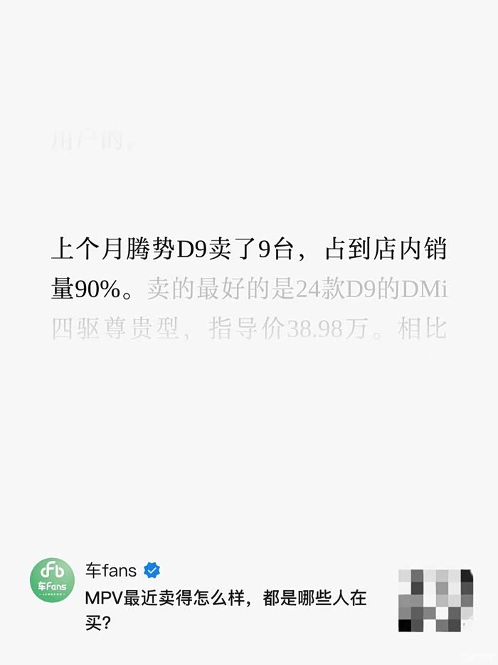 最近有媒体去摸底MPV的销量数据时偶然发现,腾势D9卖的不错,但是整个腾势就有点难受了,到今天还要靠D9这个已经到生命周期晚期的车型扛着。