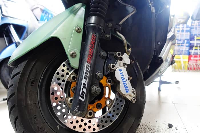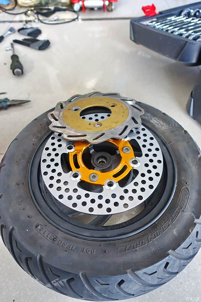 听说碟刹很重要,考虑到自己骑车的习惯(速度偏快),所以,首先要把碟刹改了!(不过这车是“前碟后鼓”的配置,而且还没有"ABS",顾不上那么多了...先把前碟刹车盘换大的!
