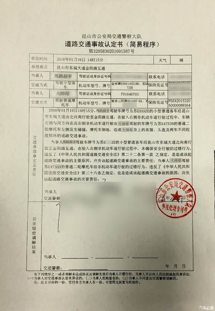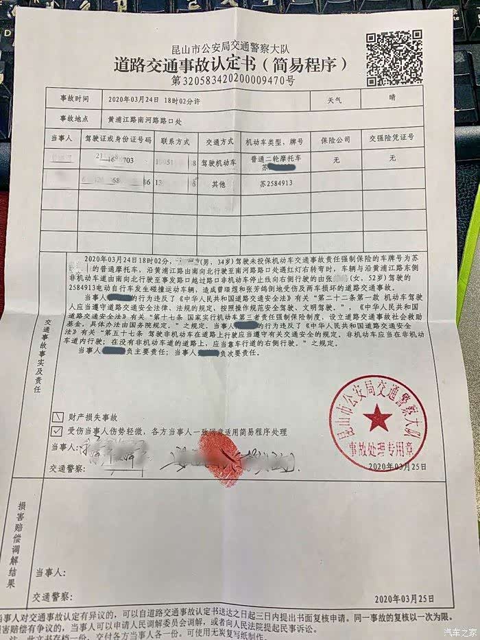 第2次事故......右转时刹车不及”轻微“的撞上一台欲闯红灯的电动车(当时以为没事,后来对方说腿有点疼,让叫救护车上医院,.....)