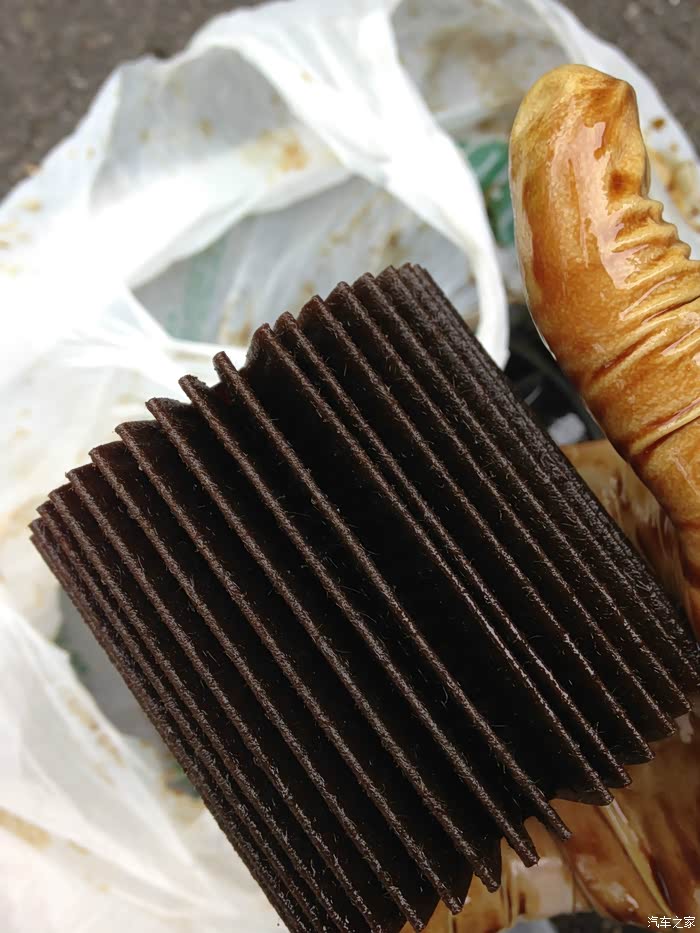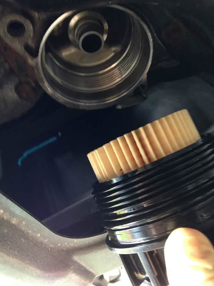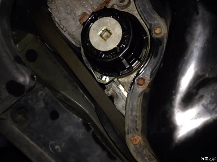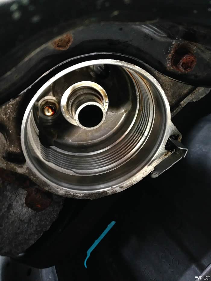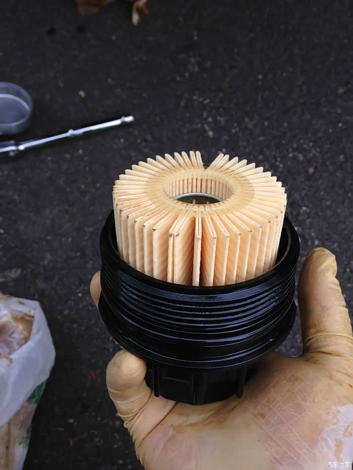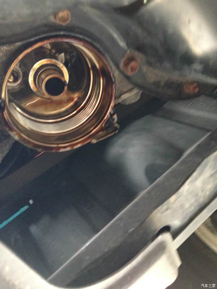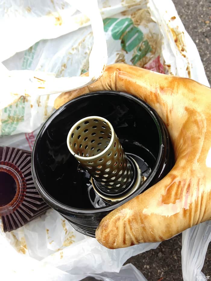 拧下来了。把油倒掉。其实最标准的步骤是现把机滤壳下面的小盖子拧下来放油,然后换个新的小橡胶圈上去,机滤里面也给了那个小橡胶圈。只是我这个之前某次修理厂保养被拧的太紧了,弄不下来,干脆就不搞了。 只是脏一点,不影响换机滤。