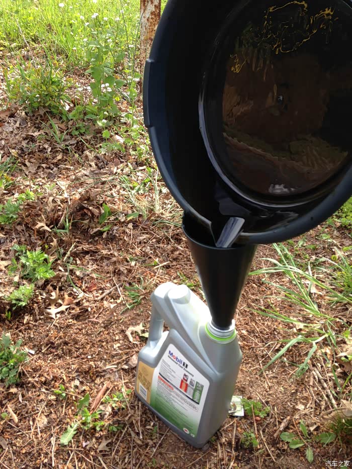 完工后,把废机油倒入刚才腾出来的旧机油桶里。拿到汽配店去回收。