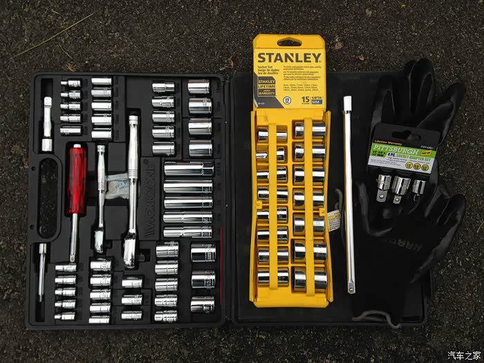 从右向左,机滤套筒,接24mm套筒,1/2到1/4英寸转接器,延长杆,棘轮扳手。这样组合起来,用来拧机滤。