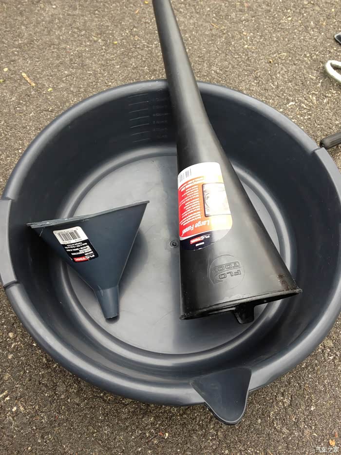 接油盆和漏斗,短的一个用来给发动机灌油,长的一个用来给废机油装瓶。