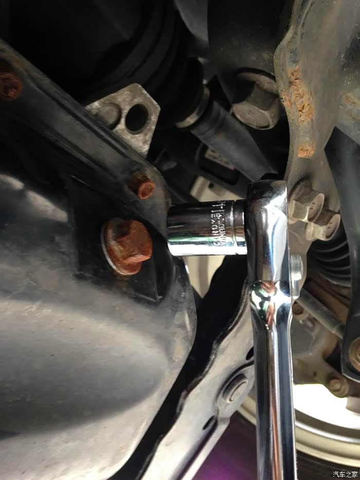 用14mm套筒+棘轮扳手,拧开放油螺丝。