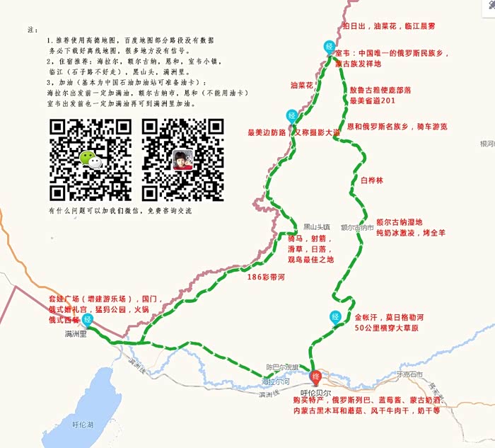 这是呼伦贝尔环游路线图,如图中备注所描述,供大家参考,因为之前看很多朋友游记中都是手绘地图,而我通过高德地图做了一个完整的线路图,全程可导航。