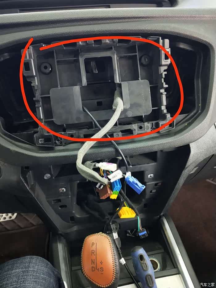 拆完以后就是这样,我已经把那个连接主机跟屏幕的白色插头线去掉了,剩下的就是主机电源、音响的总线,一个三个插口。现在的大屏都是无损安装,都有现成的配套线束,直接对插就行了,具体如果不会的可以私信我,那个是