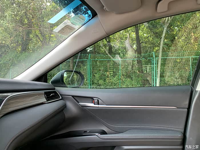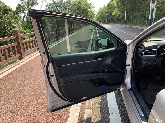 凯美瑞车门打开的幅度也是比较大的,车门可以看得到有一些真实缝线软材质包裹,还有一条银色的镀铬饰条让车门也充满了质感。