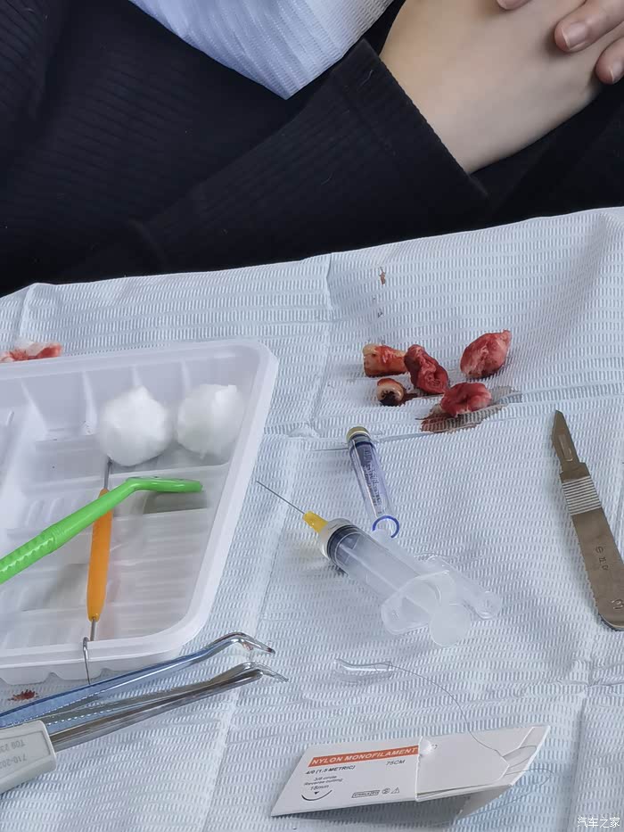 下面那个牙因为没长出来,所以动了手术后还缝了一针。医生说让我一周之后来拆线。拔完牙后,医生就把我的牙当医疗垃圾处理了,还好拔掉了,肉眼可见上面的牙已经黑了,再留着肯定会影响后面的牙。