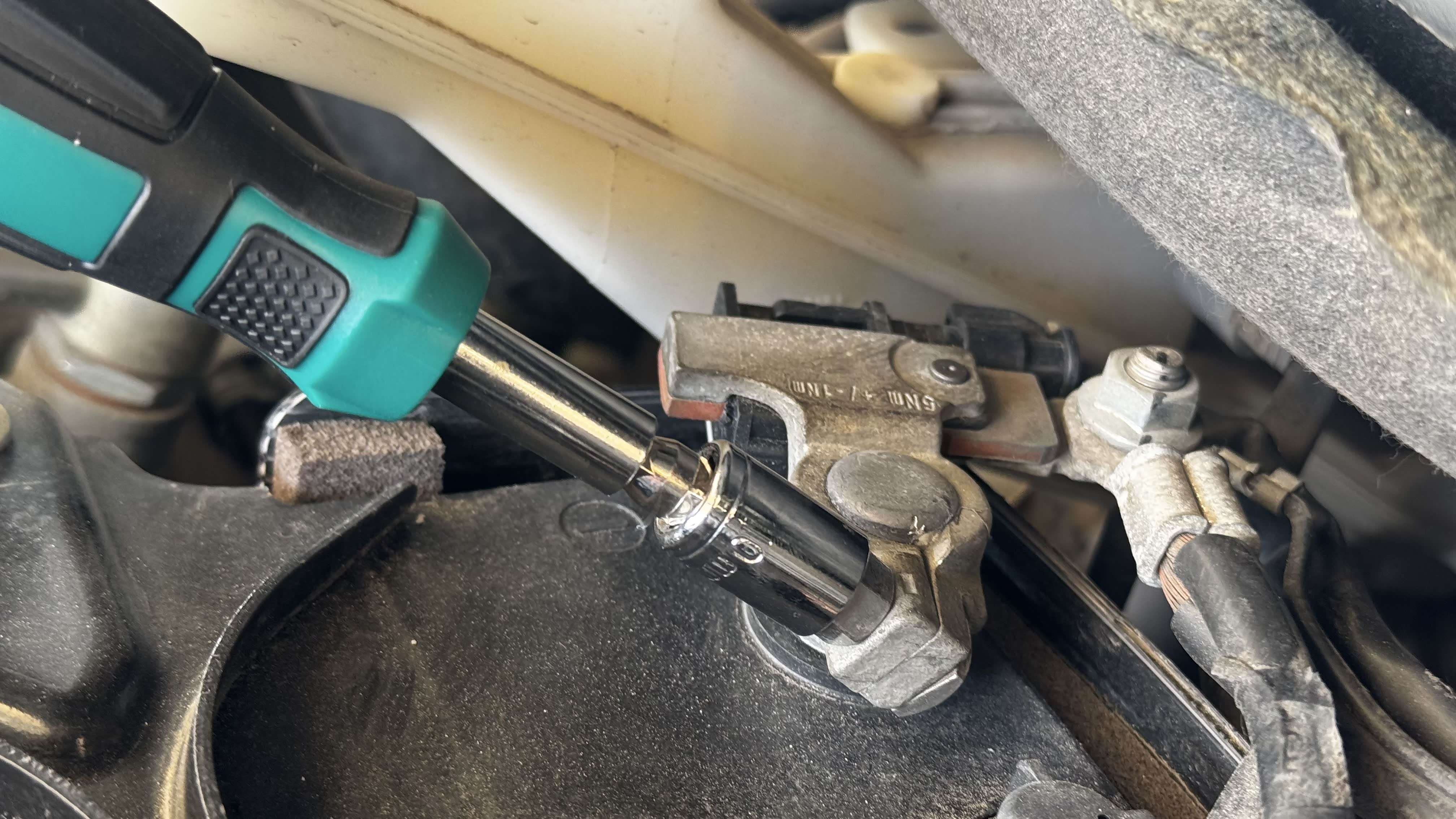 使用10毫米套筒扳手将电瓶负极线夹上的螺母松开,左右轻微转动负极电池夹,同时上提拆下,把线夹和线挪离至电瓶较远处。