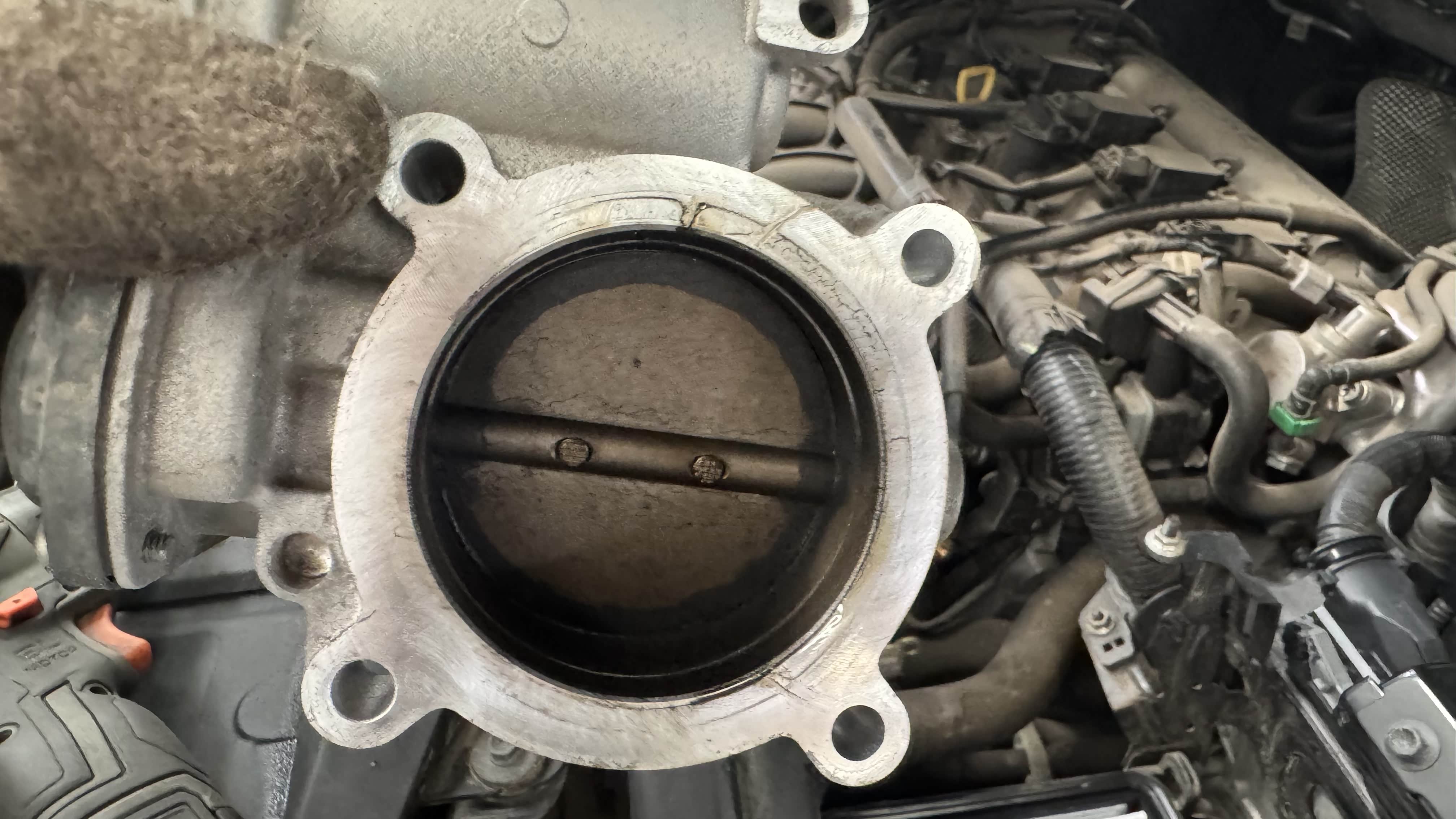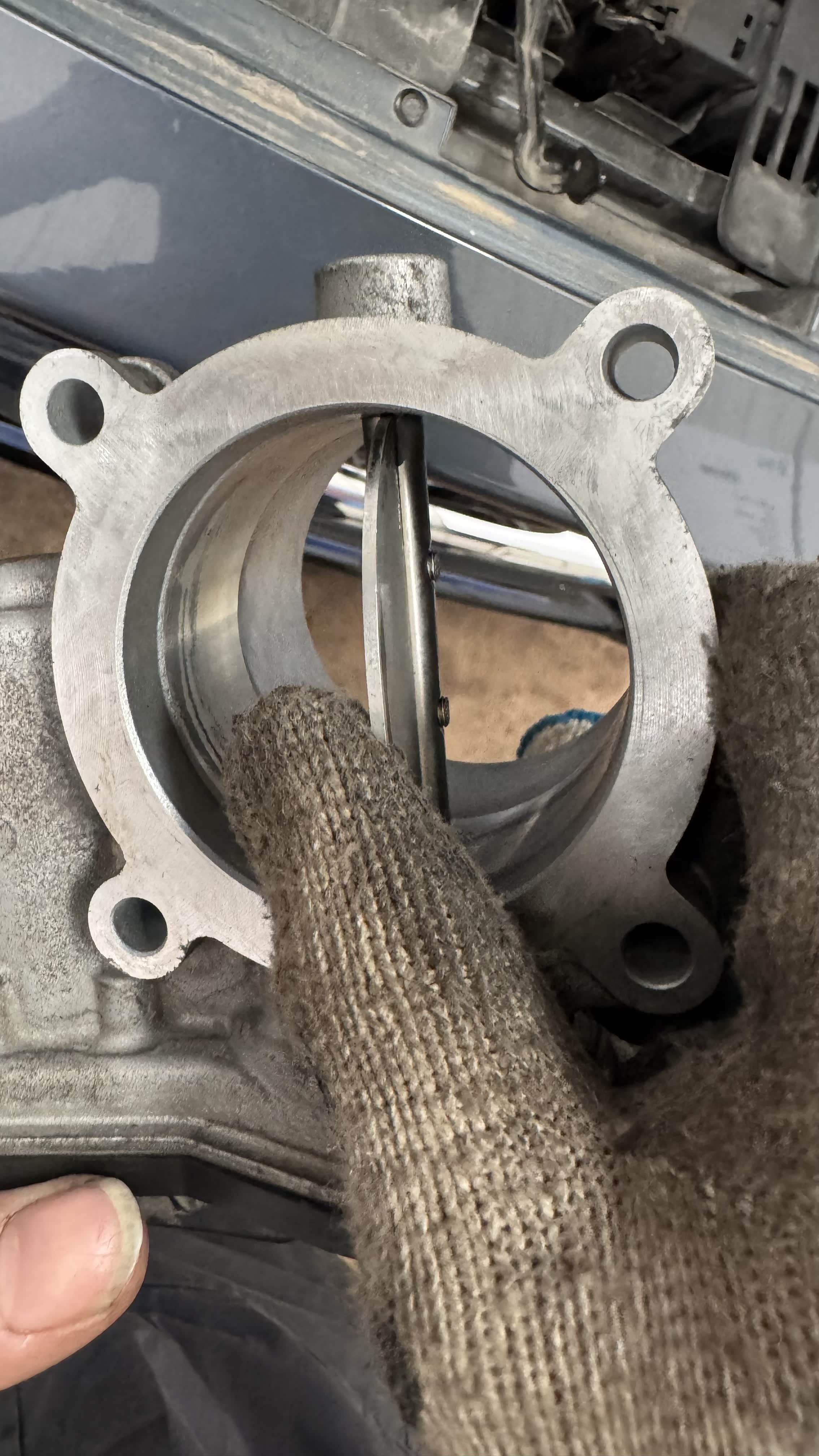 握住节气门向上下或者左右方向轻微晃动,即可拆下来。这时可以看到节气门内孔表面和翻板有一层黑色的东西。