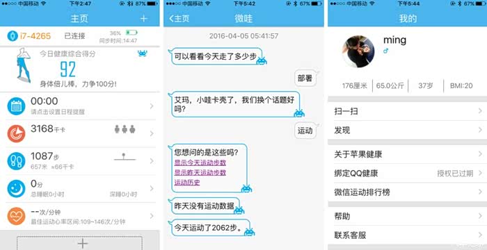 埃微健康助手APP界面分为主页、微哇和我的三大界面,主要设置及数据都在第一和第三个界面中。