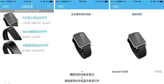 点击连接设备进入设备搜索界面,点击进行搜索手环,选择i7即可搜索到相应设备信息,点击绑定即可。
