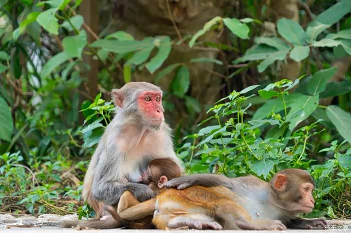 在猕猴世界里,大部分抚养后代的行为都是由母亲完成的,在猕猴中,小猴同时也会被雄性亲戚照顾,并且受到成年雄性的保护。在刚出行的头几天,小猴被母亲挂在腹部携带,并且被母亲保护不被其他群内成员接触。当小猴逐渐长大,偶尔也会被母亲背在背上,仔细观察,能够看到母亲亲吻、呵护小猴的行为。