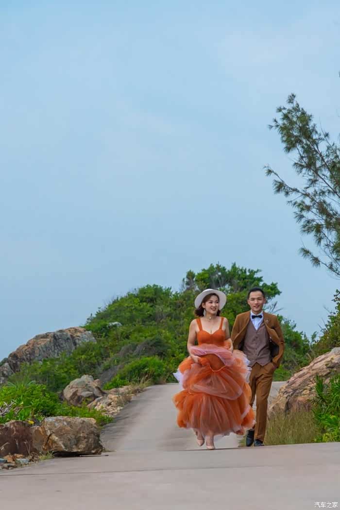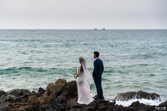 公路上、礁石上、大海边,有一对对穿着婚纱拍照的情侣们,他们在这里见证着爱情,日沿海公路也可以叫做爱情公路吧。