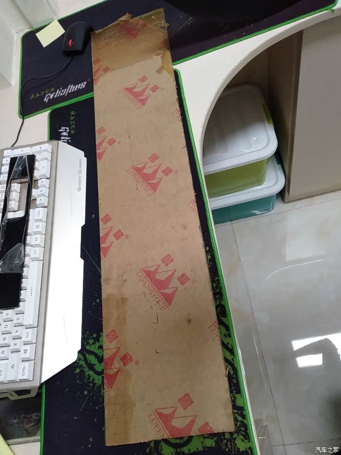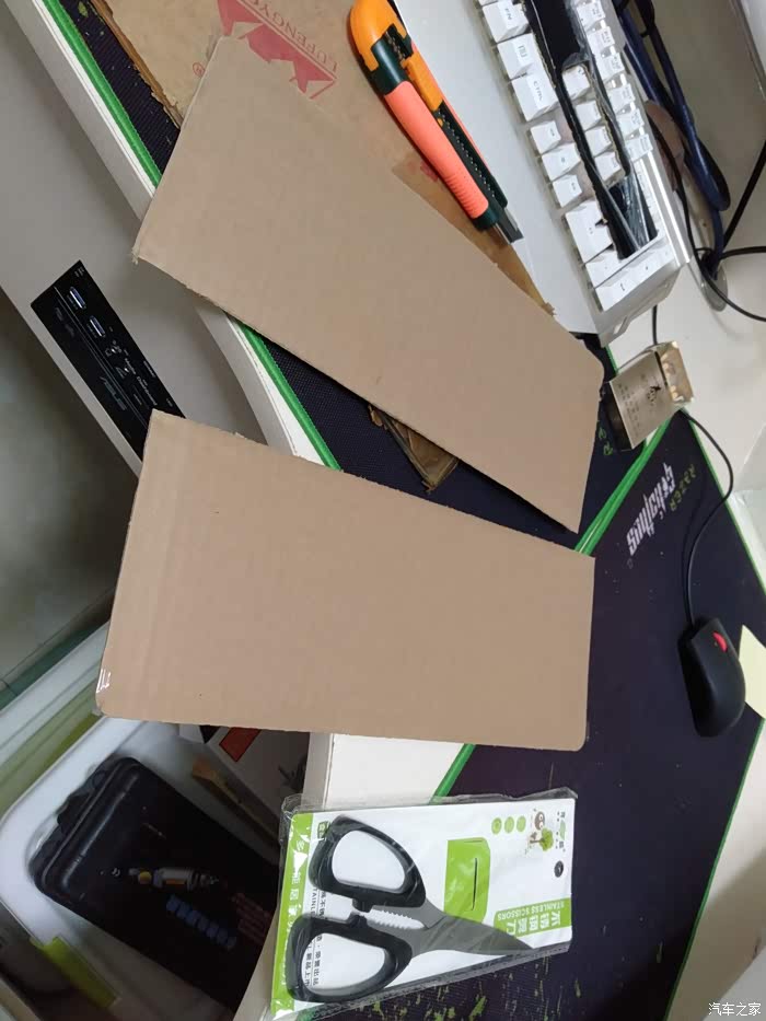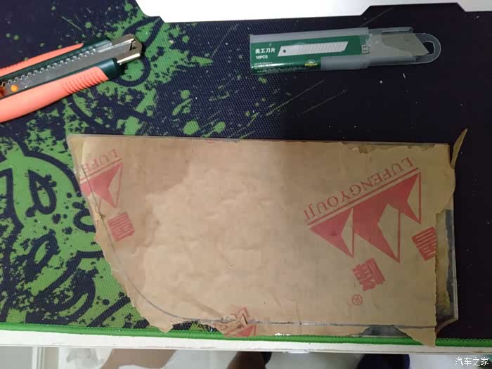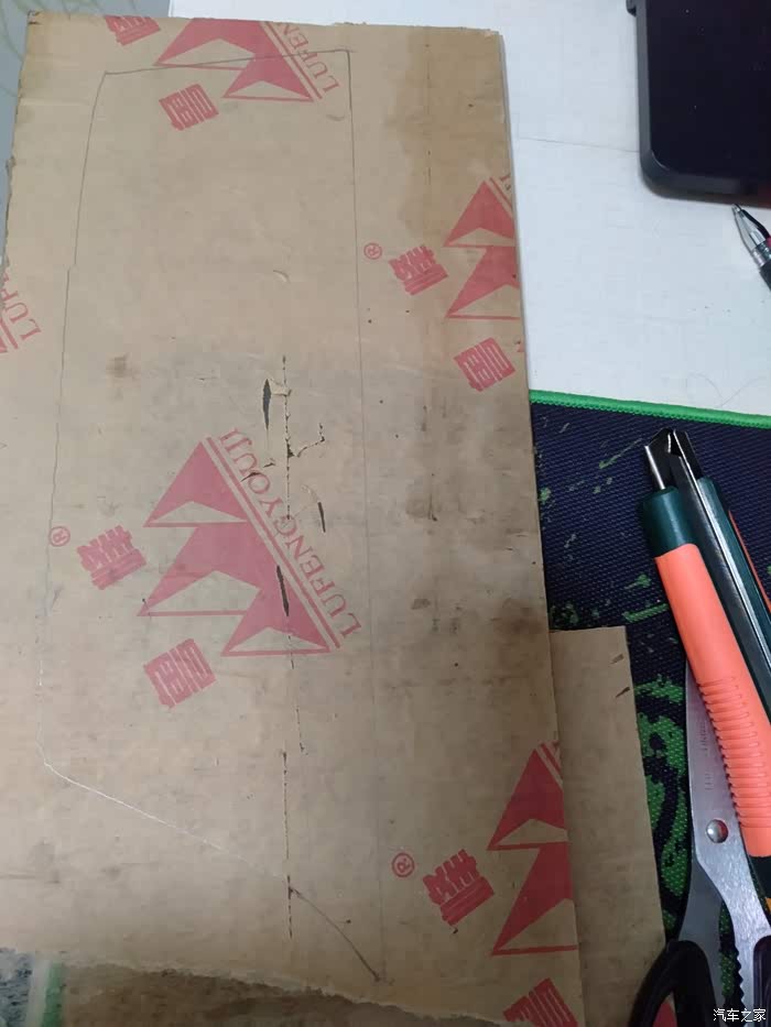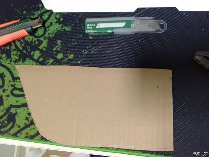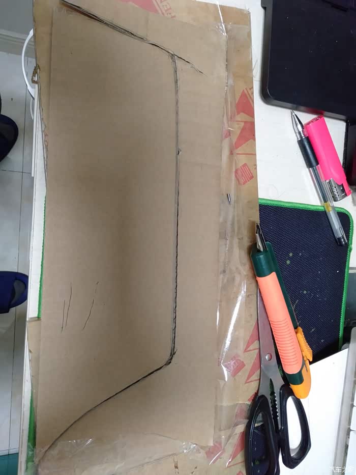 用胶带把纸板粘贴在中央通道侧面,用铅笔在内测画轮廓,拿下来用壁纸刀、剪刀按照图形剪裁