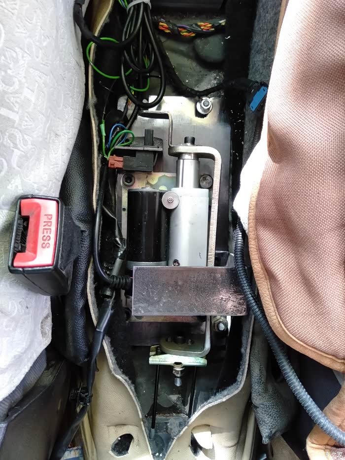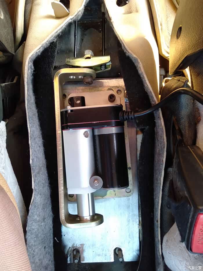 这是原车的手刹,左边红圈里的三个螺丝是用来固定手刹总成的,考虑到电机的稳定性决定用一个厚钢板做底座在5个螺纹孔的位置钻孔,把电机用螺丝固定在底座上