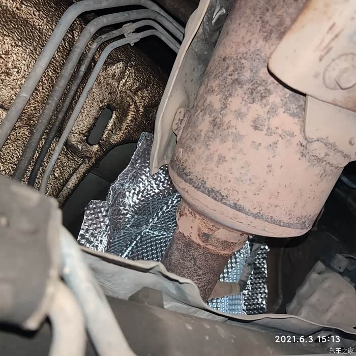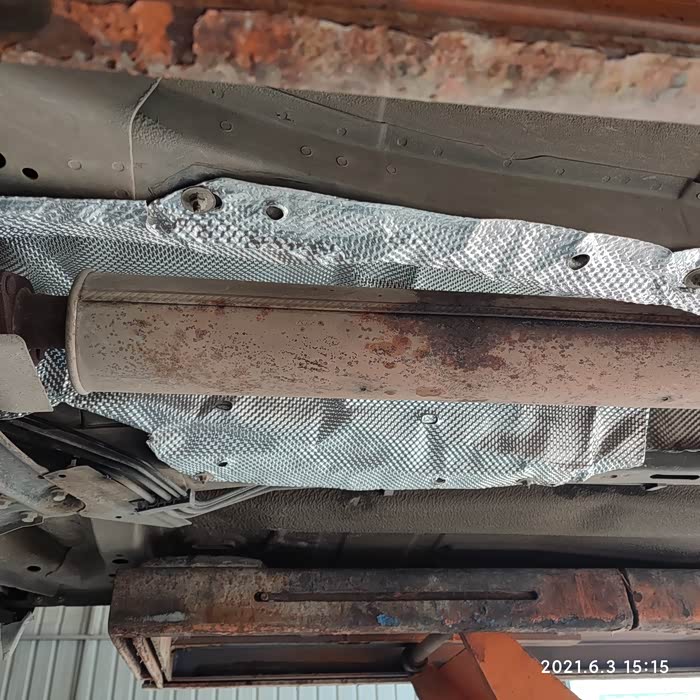 原车的隔热棉第一段是软质铝箔加隔热棉材质的,第二三段是纯硬质铝箔的,以前走山路时记得有次扯掉一个螺丝孔位也没管它,前阶段下大雨过大水路面受水流冲击整个第一段脱了一半,所以还是买个来换,更换第一段全程不需要拆除排气管,我观察了第二三段也不用拆排气管。