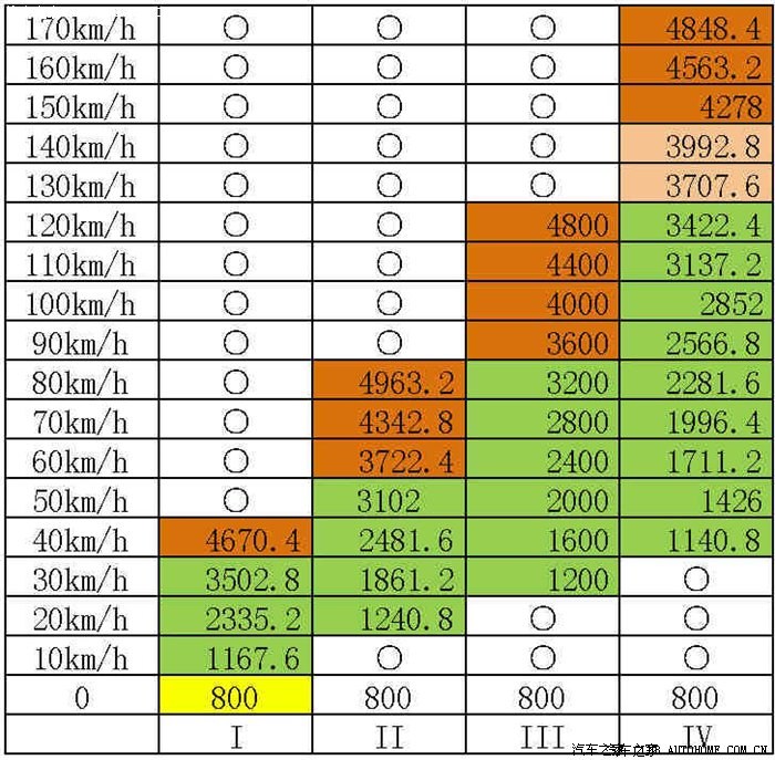大家先看一下上面这个是伊兰特悦动的4AT的各档位时的车速和转速对应表。它和卡罗拉比较接近,比如在4档60码的时候,转速都是1700多点。