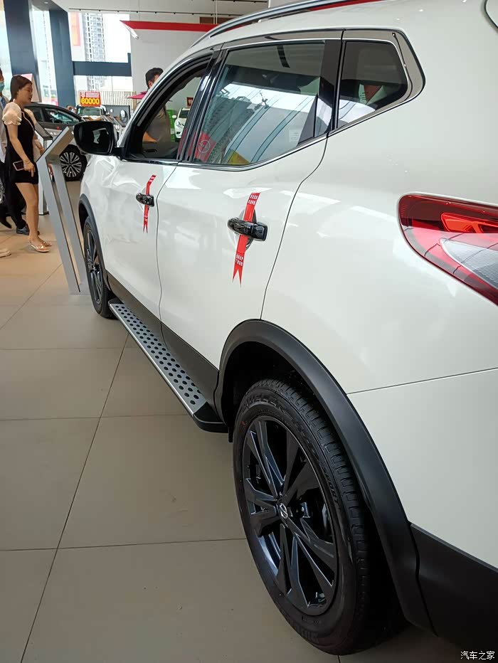 逍?夜版珠光白的外观也比较炫酷,它的外观做了多处黑化设计,黑色前脸的V字,黑色的后视镜,还有熏黑色的轮毂,车身的后面。也可以看到熏黑的东风日产字母,黑化的处理也显得更酷了。