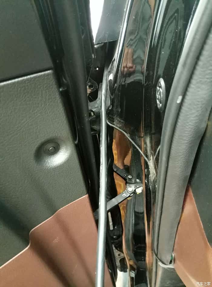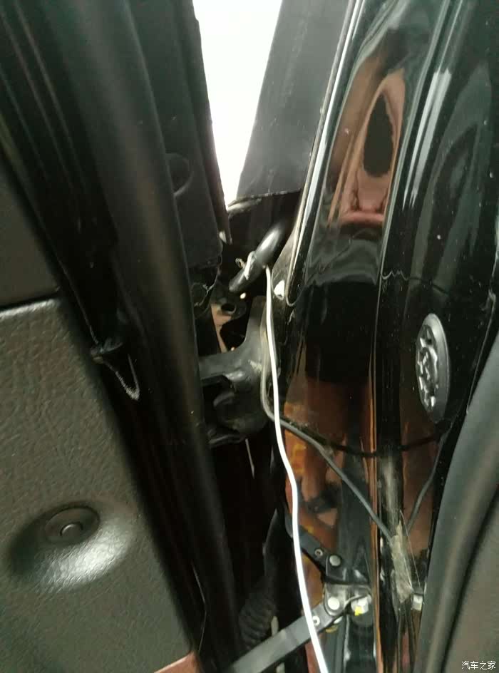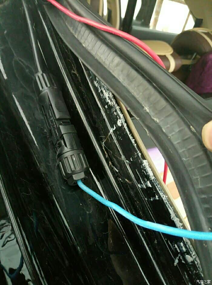 贴着门边走线进入驾驶室。这样走线,只是关门的时候要稍微用一点点小力就可以了。密封效果下大雨已经检验不会漏水的。