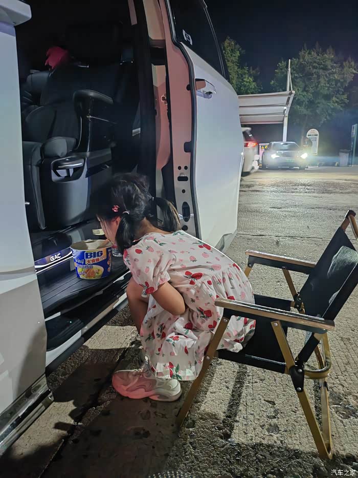 服务区闺女要吃泡面,怕洒了,只好在脚踏上吃了