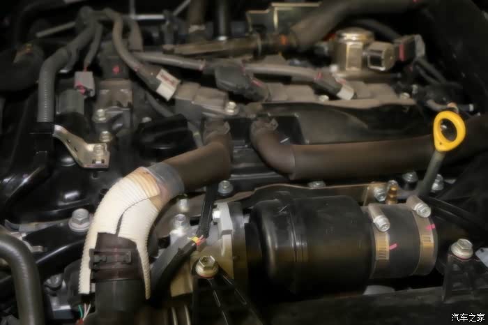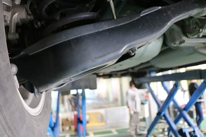 先取掉发动机装饰盖,拧开机油加注口盖,举升机顶起。特写--左前方45°。