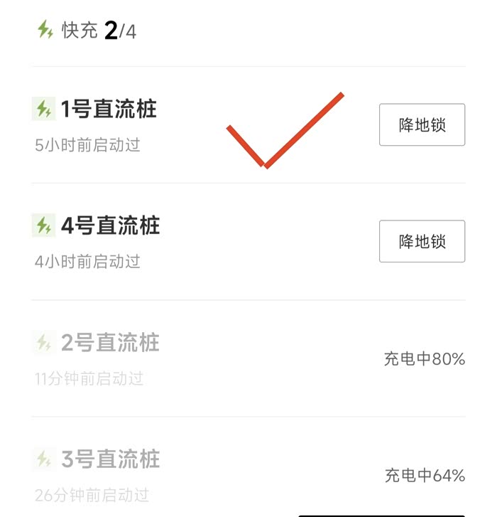 如果1号和3号桩都有车,那么2号和4号桩怎么选呢?这里也有技巧,这里有两种情况。??第一种情况,看充电的2辆车充电的进度。如果一辆车80%多,另一辆才60%,那么果断选进度快的,因为充电越到后期,功率越低,你所能分得的功率就越高,此外,他快充满了,随时会走,剩下的功率就都是你的了。
