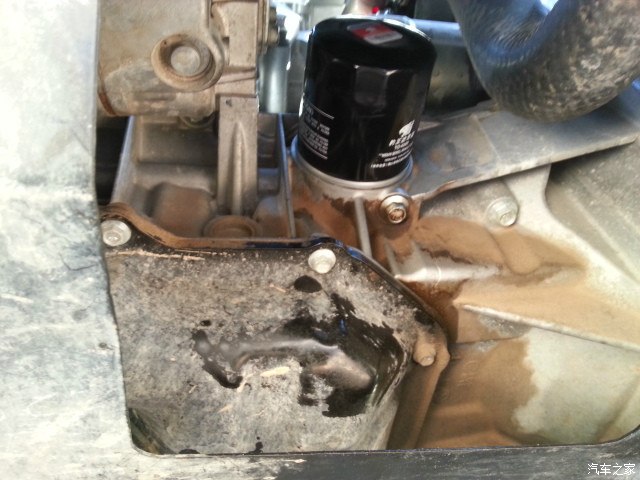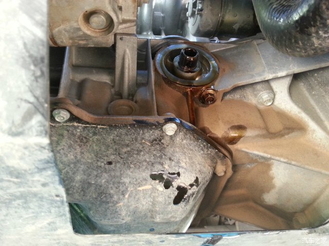 拆下机滤后,刚才拆烂了,现在流的也差不多了,擦干净准备装新的。