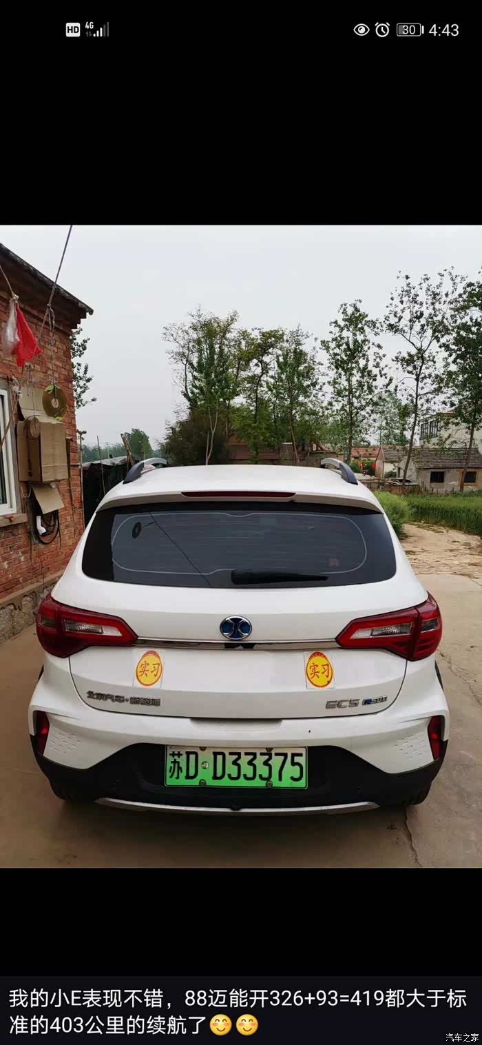 最近回了趟老家,走的高速,按120码高速开的话中途要进服务区补10块钱的电,后来我决定在高速上按匀速的开的,开的88码上下,个人喜欢这个吉利数字,最近天气也比较凉爽就全程没有开空调,地图里程为326公里,到家还剩93公里,合计都419公里了,都已经大于标准的403公里的续航了,不虚标的续航令我更加对这个车更喜欢了