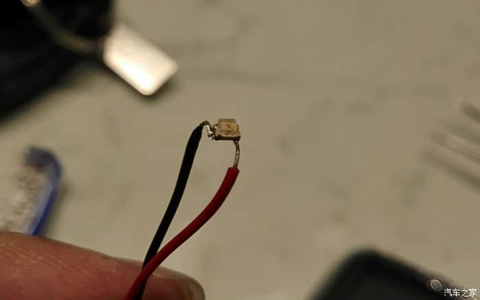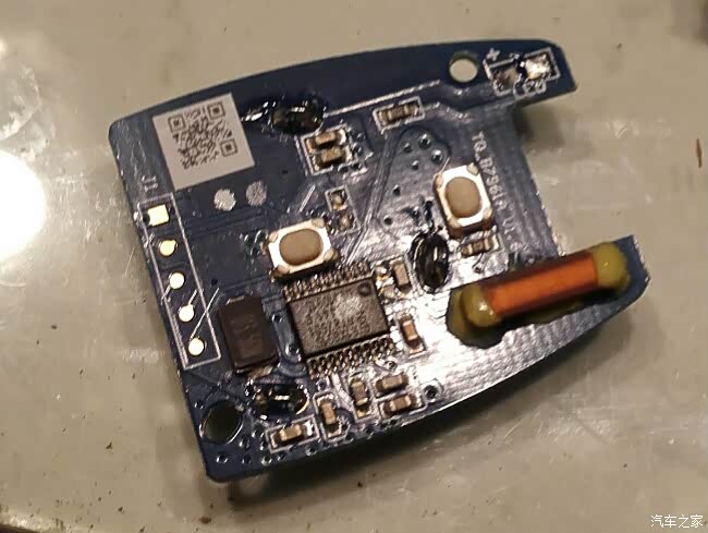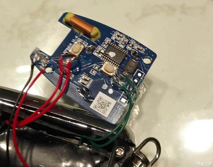 拆下来的电路板,靠凹口这里的是锁车键,左上角,有一个+的位置就是LED灯,拆的时候,用电烙铁快速的在两边移动加热即可。