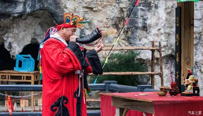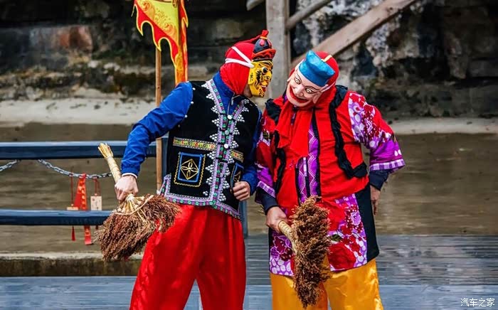 只要非大雪、大雨等极端天气,夜郎谷在固定时间内都有演出呈现,核心节目是傩戏,这个地方戏主要流行于贵州铜仁一带,用方言演唱,因此在表演之初,主持人通常会做简单的背景介绍。