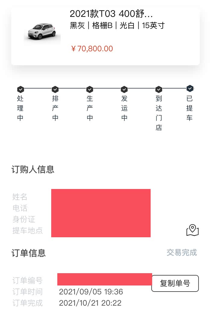 往上看了一些评测视频,也对比了一些数据,觉得零跑T03比较符合我的定位和要求,周末就和家里领导去4S店看车,领导心里比较喜欢五菱mini,但我觉得mini有点小,续航比较少,最主要是没有快充,万一以后新小区车位不让装充电桩,那我这个车咋搞,所有我心里基本以及定下了零跑,4S店简单试驾了一下车子,确实比五菱mini要好开。回去后第二天,在微信上跟销售聊了半天,优惠也不肯给了,就手机上直接下了订单,然后开始漫漫等车。