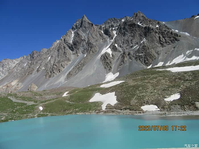 从那拉提草原出来前往独山子市路上。过3390米哈希勒根达板后,藏着一座仙境蓝天池,没有具体的名字,是个漂亮的高山融湖,呈淡淡的绿色,清澈静谧,从不同的角度和距离可以看到不一样的颜色,一会儿是透蓝的,一会儿是碧绿的,一会儿是完全透明的,变幻多姿。