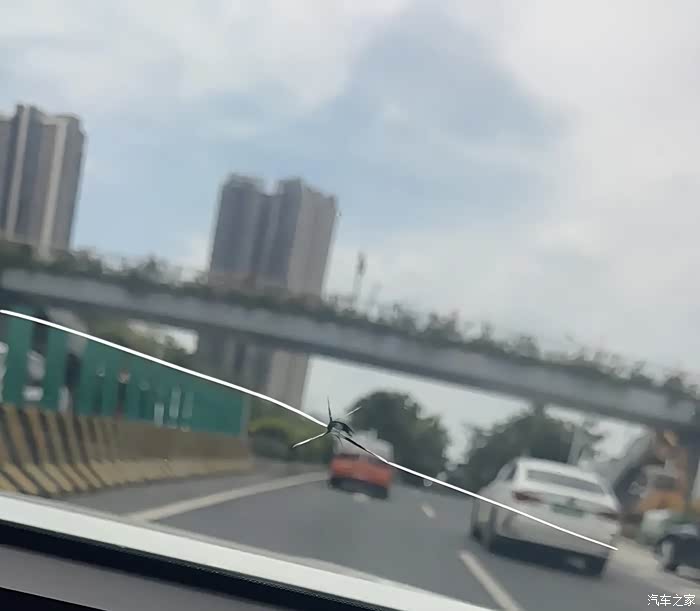 国庆假期的期间出去耍,这次开车去越野,经过盘山路的时候,突然不知从哪里飞来一块小石子打到了前风挡玻璃上,一开始就是打破了一个小坑,也没有在意,途经高速的时候,听到前风挡玻璃咔嚓一下然后就出现了下面照片上的情况,出现了一到大裂痕,完蛋了,一开始觉得一点小坑不用管它的,这下好了,一条大裂痕几乎贯穿了整个风挡玻璃,心也碎了,小心翼翼的开回老家准备报保险换玻璃了。