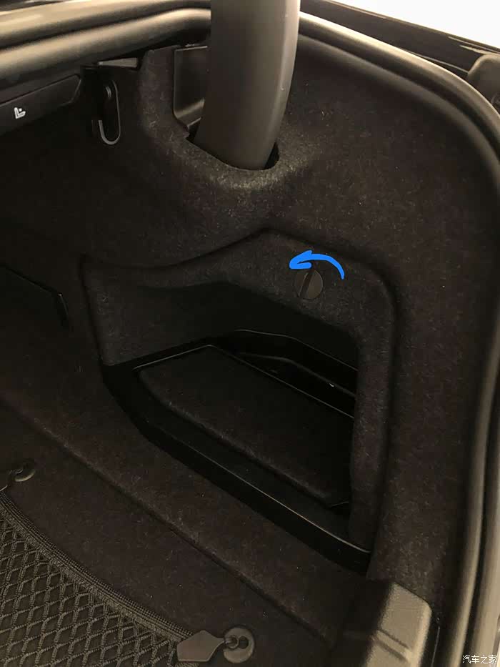 因为今天操作的东西设计电路, 就先要断电。 4系和M4电池在后备箱, 蓝色箭头方向拧开这个黑色卡扣。 盖板就可以拿掉了。