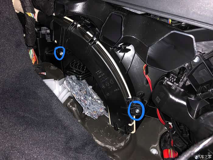 如图,蓝色圈这个黑色盖子下面有空调外循环的进气口, 要拆掉这个盖板, 下面还有1个盖板要拆掉, 以及其他不少东西。 进气口有蜂窝网, 进气口盖是橘色。