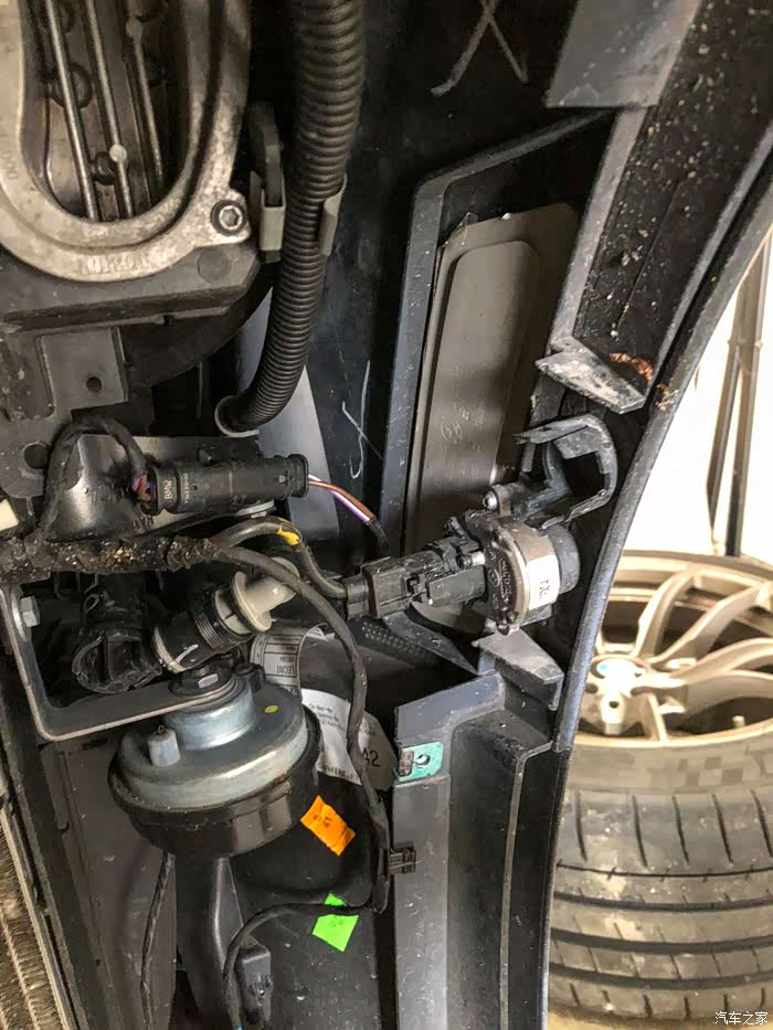 这一侧和左侧差不多, 从上至下那根粗粗的黑管子就是玻璃清洗的水管, 水箱在前轮后面的轮罩里。