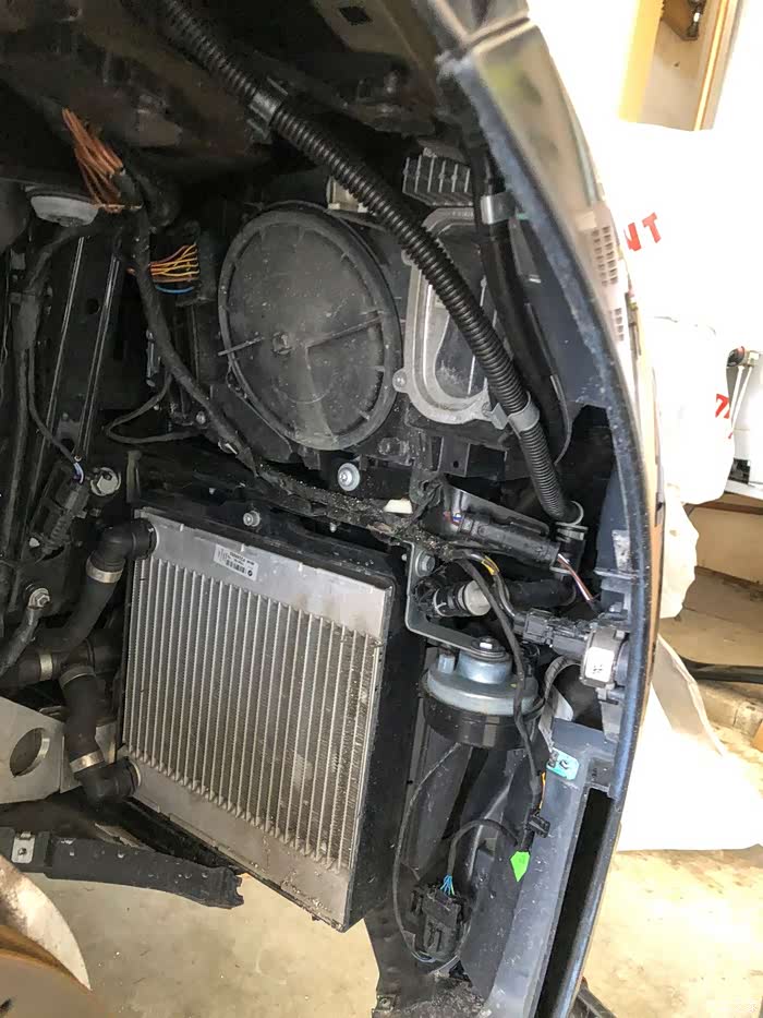 接下来拆反光片, 反光片是靠四周一圈胶粘在前杠内侧的。 直接硬抠, 怕会有破坏性。 热风枪加热胶, 软化效果很明显, 很容易就拆下来了。 我不从外侧烤是因为前杠本身很厚, 我也怕把漆烤坏。