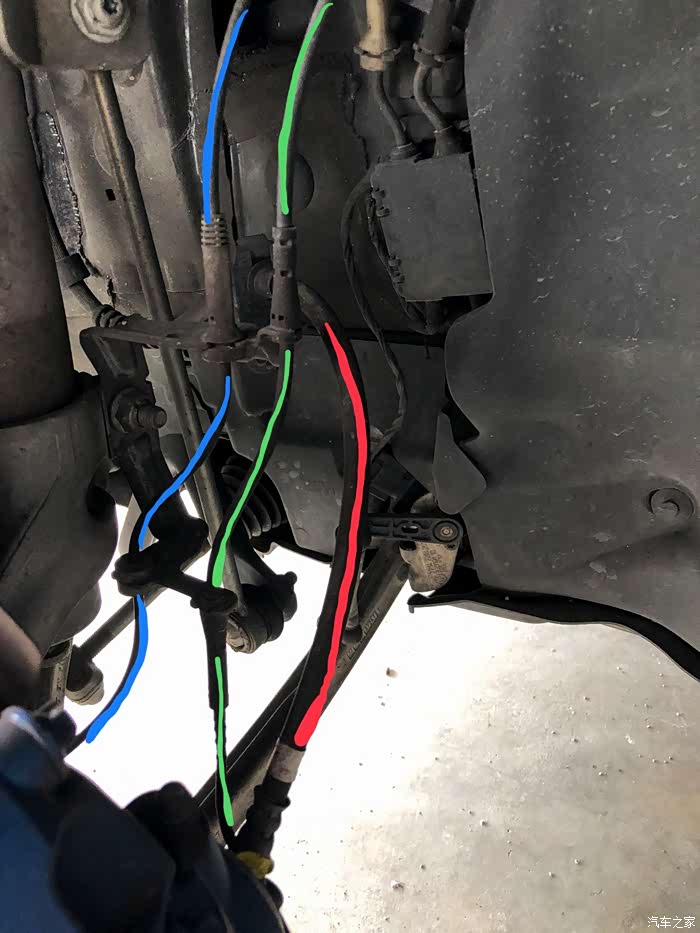 蓝色看着好像是车轮速度传感器之类的, 绿色应该是ABS? 红色刹车油管。
