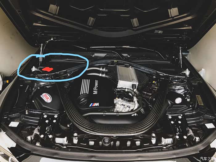 车刚买回来我洗了空调, 这个盖板拆起来实在麻烦, 而且M4 因为有那根U型碳纤维顶吧, 这盖板只能卡在里面, 喷液体的角度和姿势都很难受, 我就懒得再拆开. 直接对着红色箭头处喷了一波. 还是有效的, 但是会浪费大量液体.